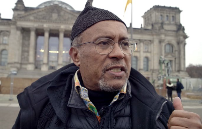 Henri Manga freut sich in einer anderen Szene über die Anerkennung, die Rudolf Duala Manga Bell in Deutschland heute erfährt und sieht es als ein positives Zeichen an, dass die Zeit der Aufarbeitung der deutsch-kamerunischen Geschichte nun endlich gekommen sei. »In Duala und Kamerun erwartet man eine echte, endgültige, reale und totale Reha­bilitierung von Rudolf Duala Manga Bell.« Nach der Einweihung des Rudolf Duala Manga Bell Platzes in Berlin, bei der die Aktivistin und Schriftstellerin Sharon Dodua Otoo in ihrem Redebeitrag bewegende Worte über das erinnernfand, steht Jean Pierre Félix Éyoum mit dem Botschafter Kameruns und dem amtierenden Duala-König vor dem Reichstagsgebäude. An jenem Ort also, wo einst Rudolf Duala Manga Bell gegen koloniales Unrecht aufbegehrt hatte. Vergebens, wie wir wissen.