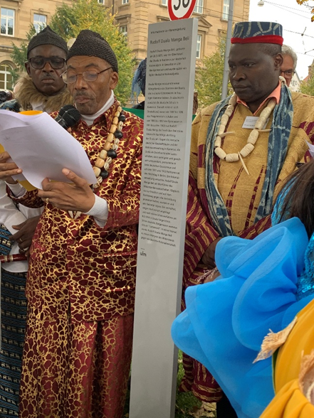 Nicht nur in Berlin, auch in Ulm und Aalen, dort wo der kamerunische Prinz lebte, hat ein Umdenken eingesetzt. Im September 2022 trug sich der amtierende Manga-Bell König ins Buch der Stadt Ulm ein und weihte mit einer zeremoniellen Handlung den Rudolf-Dou­ala-Manga-Bell-Platz ein – in der Stadtmitte gelegen, zwischen dem historischen Justiz­gebäude und dem Neubau der Staatsanwaltschaft Ulm – und in unmittelbarer Nähe eben.